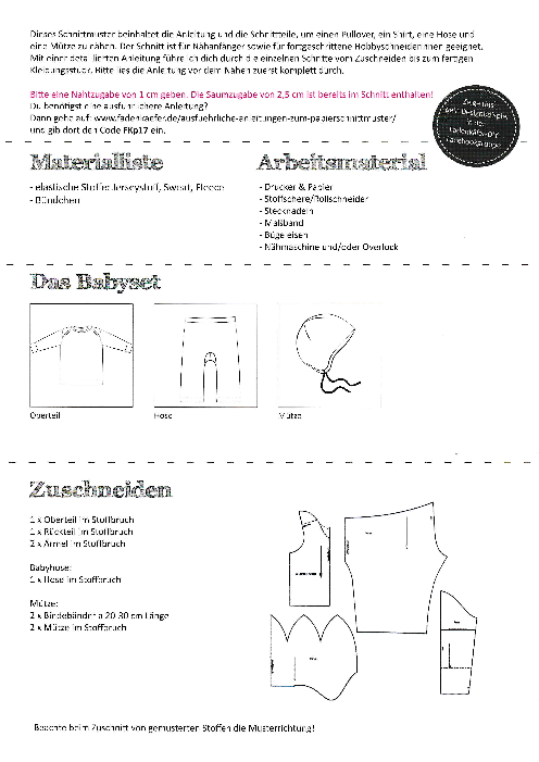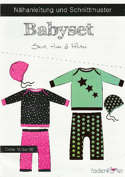 Dieses Set enthält Schnittmuster und Anleitung um ein Babyset bestehend aus Shirt/ Pullover, Hose und Mütze zu nähen.