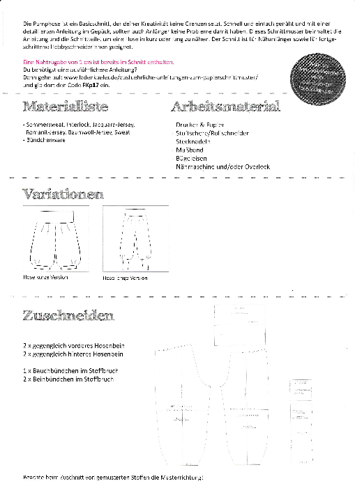 Dieses Schnittmuster beinhaltet die Anleitung und alle Schnittteile, um eine gemütliche Pumphose zu nähen. Der Schnitt ist für Nähanfängerinnen und -Nähanfänger sowie für fortgeschrittene Hobbyschneiderinnen und Hobbyschneider geeignet.