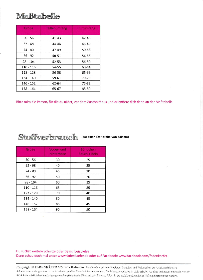 Materialempfehlung: elastische Stoffe ( Sommersweat, Interlock, Jacquard-Jersey, Romanit-Jersey, Strick oder Baumwoll-Jersey, Bündchen)